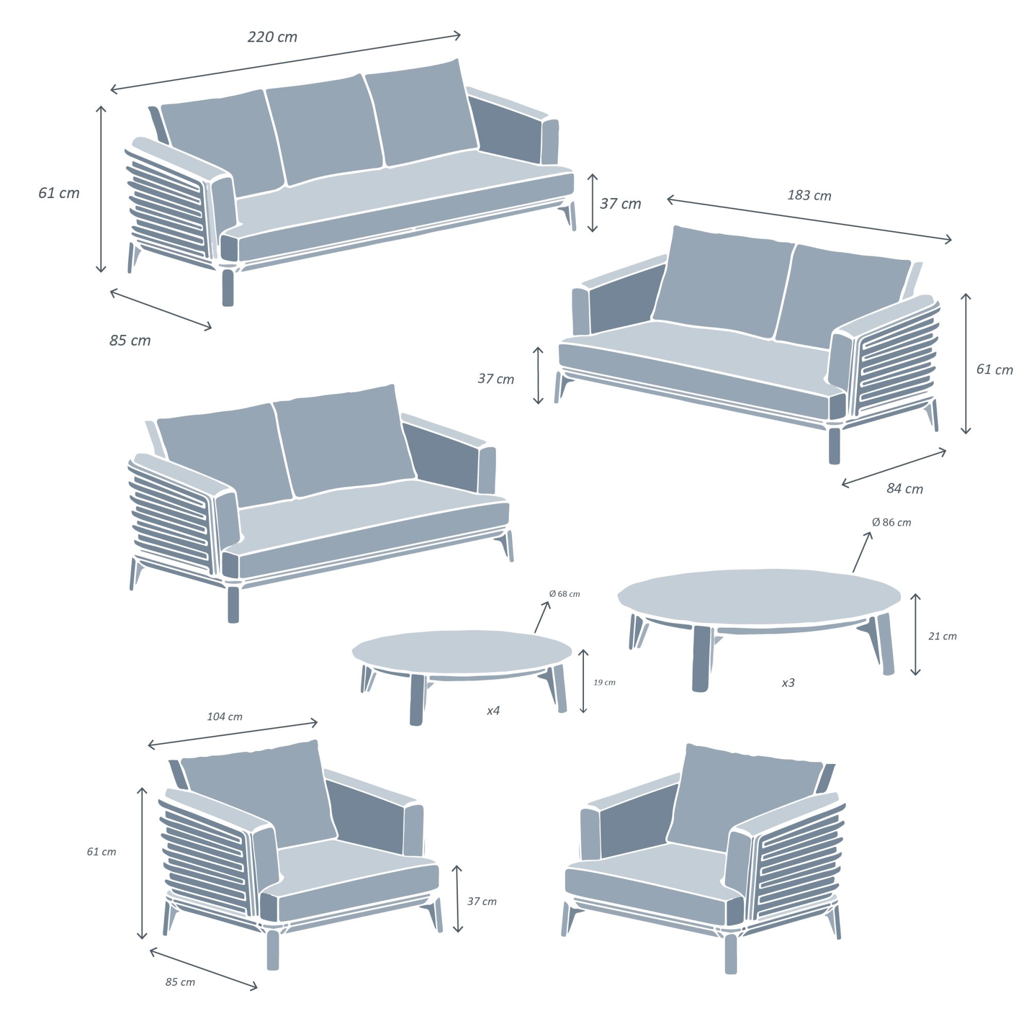 Dimensioni: - Poltrona con braccioli: lunghezza 104 x profondità 85 x altezza 61 cm. - Divano 3 posti: lunghezza 220 x profondità 85 x altezza 61 cm. - Divano 2 posti: lunghezza 183 x profondità 85 x altezza 61 cm. - Tavolino rotondo S: diametro 68 x altezza 19 cm. - Tavolino rotondo M: diametro 83 x altezza 21 cm. - Profondità della seduta: 81 cm senza cuscino. - Altezza dello schienale dalla seduta: 39 cm. - Altezza del bracciolo: 61 cm. - Cuscino della seduta divano 3 posti: lunghezza 212 x larghezza 89 x spessore 16 cm. - Cuscino della seduta divano 2 posti: lunghezza 180 x larghezza 83 x spessore 16 cm. - Cuscino della seduta poltrona: lunghezza 100 x larghezza 83 x spessore 16 cm. - Altezza della seduta con cuscino: 37 cm. - Altezza della seduta senza cuscino: 21 cm.