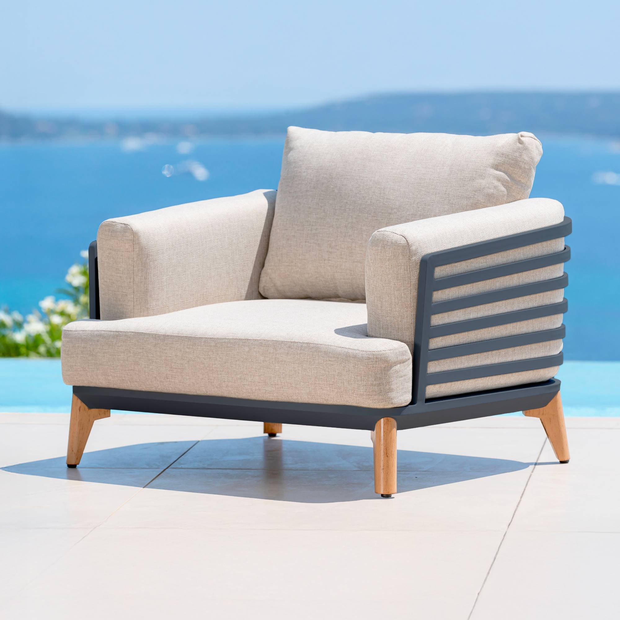 • Una linea originale, moderna ed elegante • Alluminio robusto e gambe con effetto legno realistico • Comfort eccezionale con 4 cuscini per ogni elemento